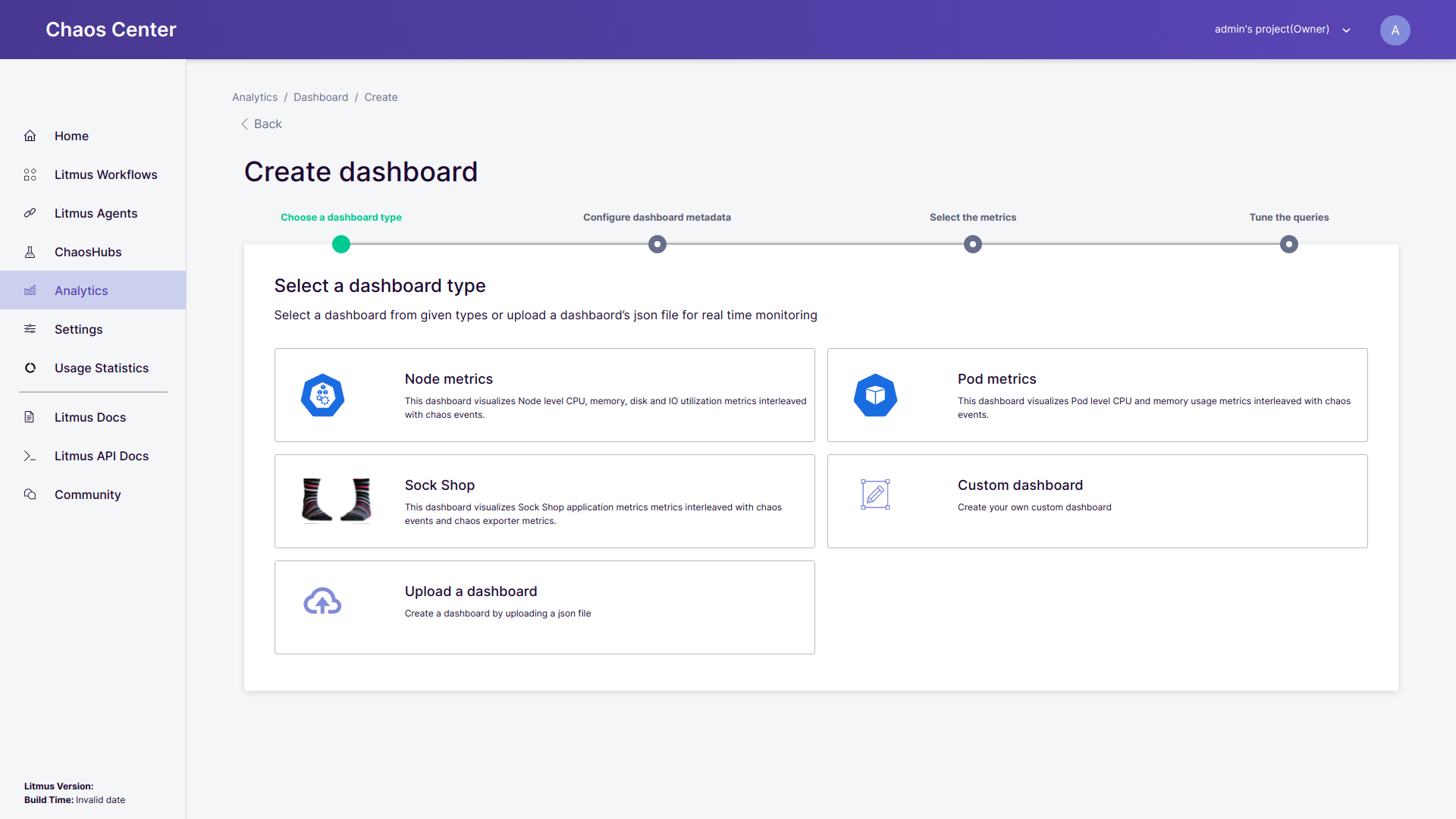 • chaos delegate: Select the chaos delegate for which you want to set up the dashboard. By default, an chaos delegate from the list of all connected chaos delegates is selected for you. You may override this as per your requirement.