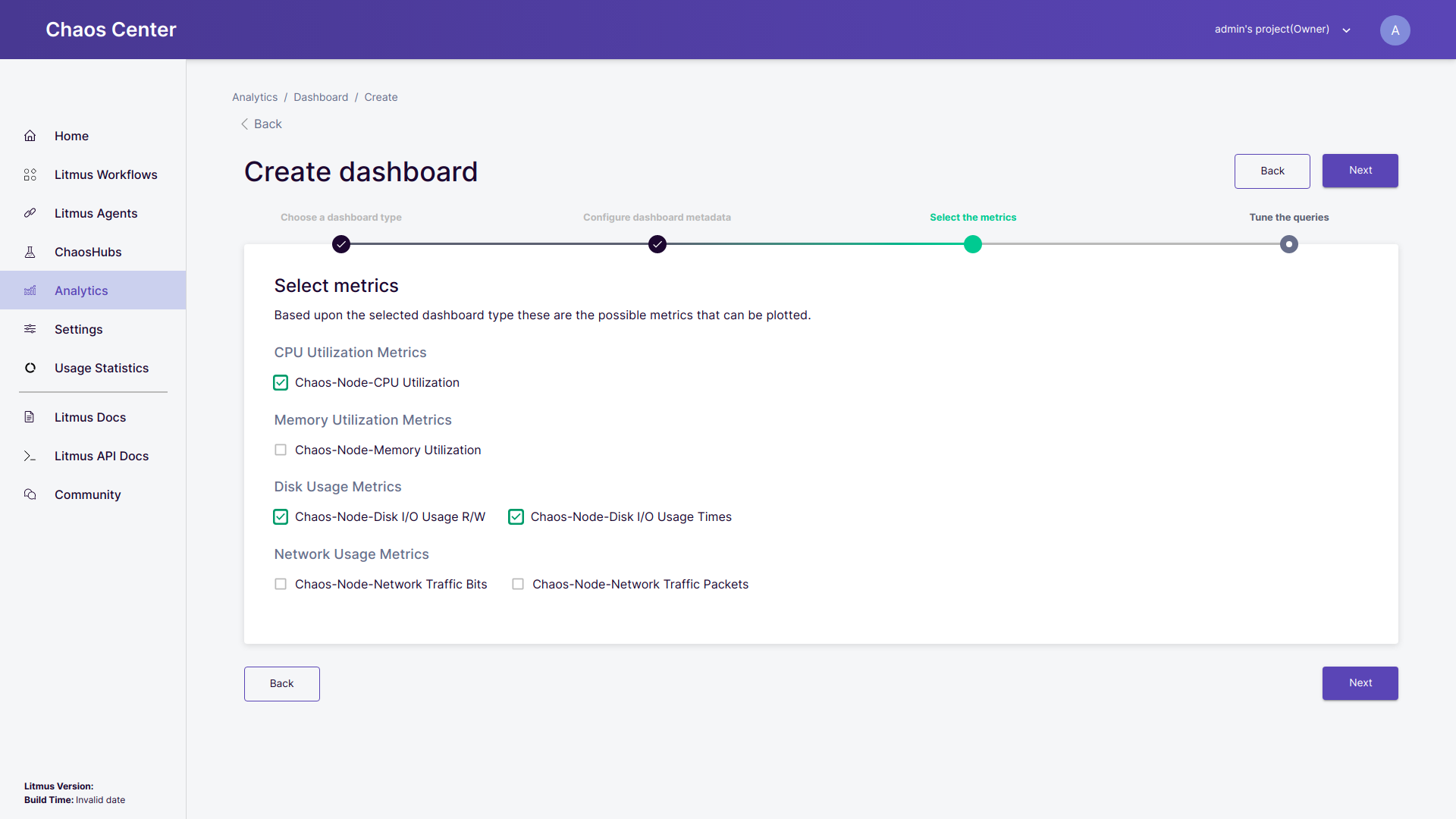 • Select the metrics: For the predefined dashboards, the checklist of the corresponding metrics is provided from which you may select the required metrics to be plotted.